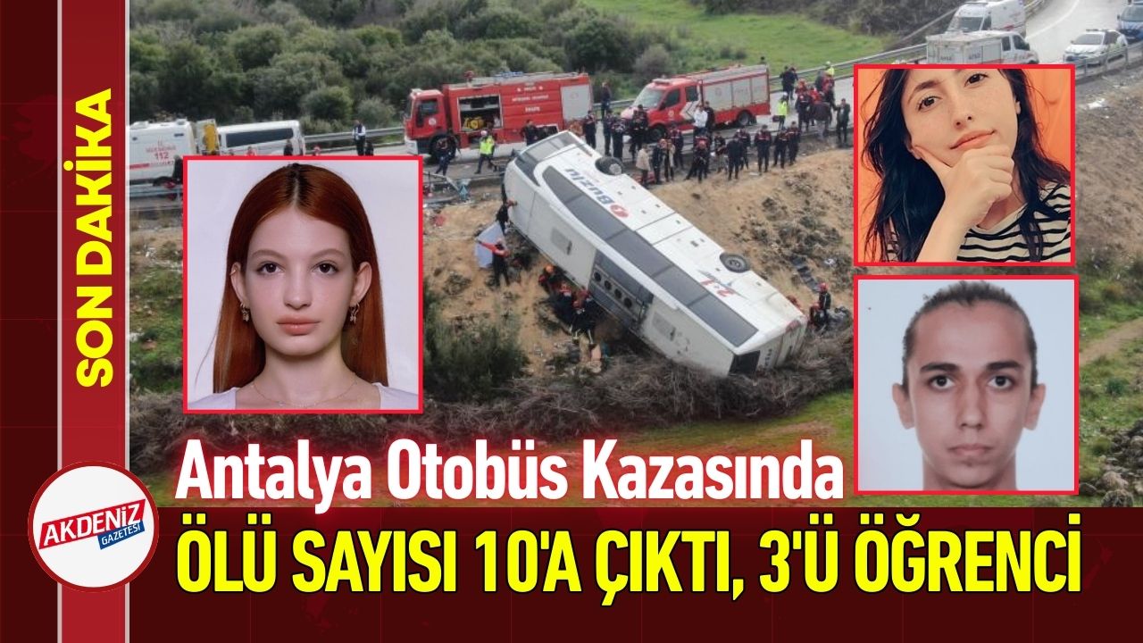 Antalya’da yolcu otobüsünün devrilmesi sonucu meydana gelen trafik kazasında hayatını kaybedenlerin sayısı 10’a yükseldi. Feci kazada yaşamını yitirenler arasında Akdeniz Üniversitesi’nde öğrenim gören 3 öğrencinin bulunması acıyı daha da derinleştirdi.