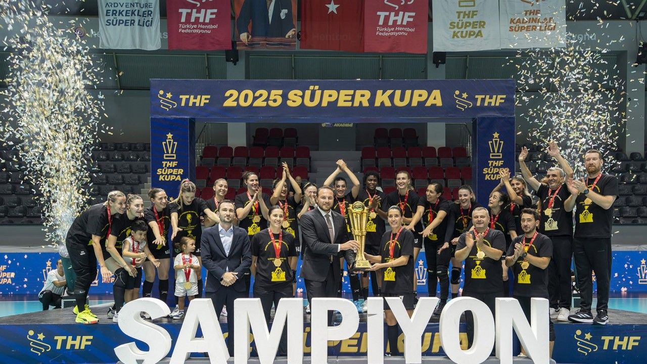 Hentbol Kadınlar Süper Kupa 2025’in şampiyonu Bursa Büyükşehir Belediyesi Spor Kulübü, maçın ardından düzenlenen törende kupa ve madalyalarını aldı. Türkiye Hentbol Federasyonu Başkanı Mesut Çebi ve Yönetim Kurulu Üyesi Sinan Başer, şampiyon Bursa Büyükşehir Belediyesi Spor Kulübü’ne kupa ve madalyalarını takdim etti.