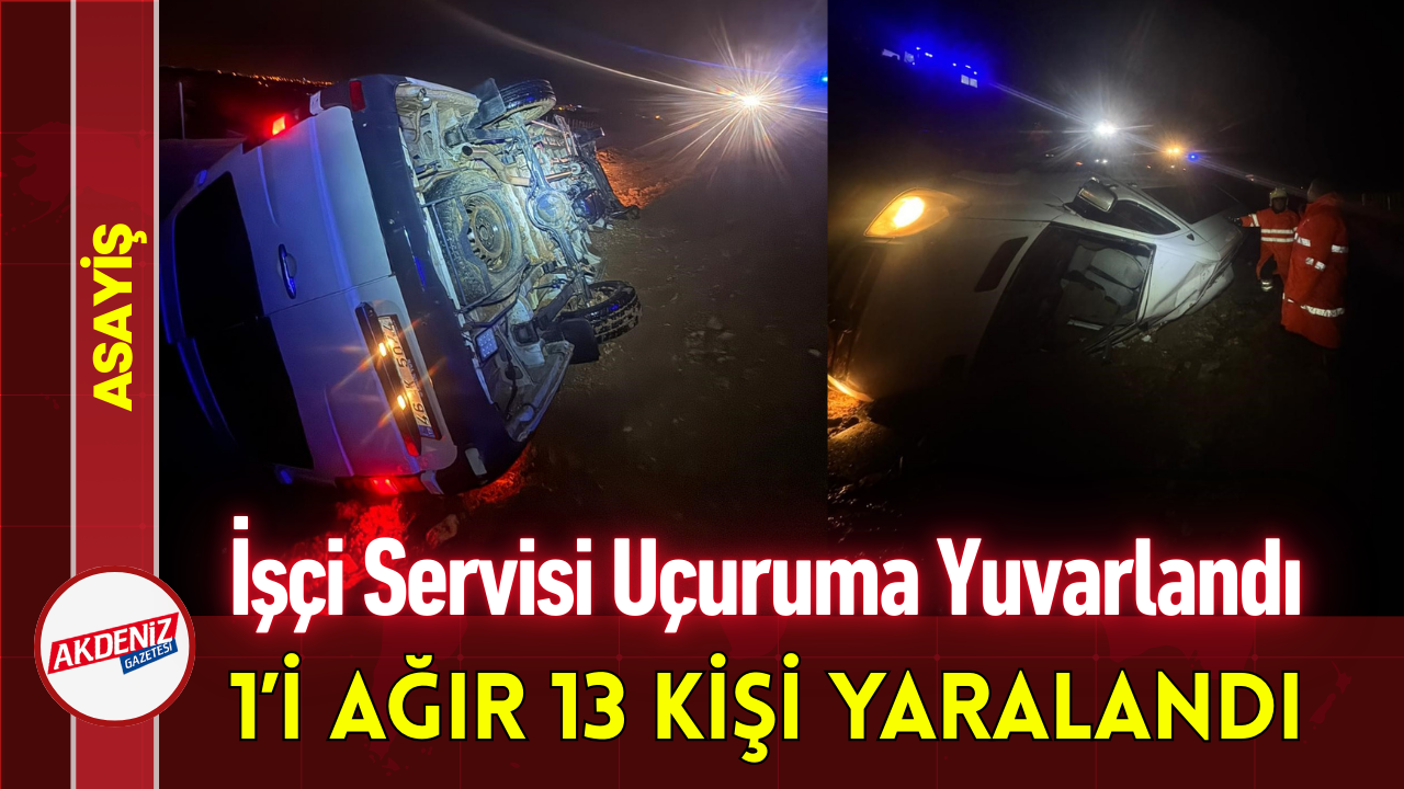 Kaza, Erdemli ilçesi Tömük Mahallesi’nde otoyol çalışmasının sürdüğü şantiye yolunda meydana geldi. Alınan bilgiye göre, Arif A. idaresindeki 46 K 5044 plakalı işçi servis minibüsü, yağışlı havada sürücüsünün direksiyon hakimiyetini kaybetmesi sonucu yoldan çıkarak yaklaşık 50 metre yükseklikten uçuruma yuvarlandı. Kazayı fark edenler durumu 112 Acil Komuta Merkezi’ne bildirdi. Merkez bölgeye sağlık, jandarma ve itfaiye ekiplerini sevk etti. Mersin Büyükşehir Belediyesi İtfaiye Dairesi Başkanlığı’na bağlı ekipler kısa sürede bölgeye gelerek yan yatan araç içerisinde bulunan yaralıları kurtardı. Yaralılar, arazinin engebeli yapısı ve yağışlı hava şartları nedeniyle iş makinelerinin de desteğiyle uçurumdan yukarı taşınarak ambulanslara ulaştırıldı. Kazada sürücüyle birlikte yaralanan 1'i ağır 13 kişi ambulanslarla hastanelere sevk edildi.