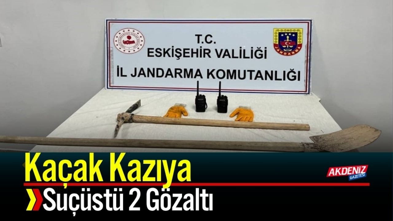 Eskişehir İl Jandarma Komutanlığına bağlı birimlerin çalışması neticesinde Odunpazarı ilçesinde şüpheli şahısların kaçak kazı yaptığı bilgisi alındı. 1'inci derece arkeolojik sit alanında jandarma ekiplerince icra edilen operasyon neticesinde 2 şüpheli şahıs kaçak kazı yaparken suçüstü yakalandı. Kazı alanında yapılan incelemede şüphelilere ait olduğu tespit edilen 2 adet el telsizi ve muhtelif kazı malzemeleri ekiplerce ele geçirildi. Şüpheli şahıslar soruşturma başlatıldı.