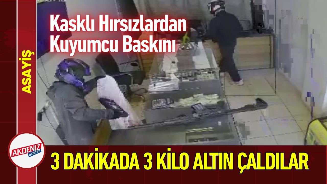 Hatay’ın Kırıkhan ilçesinde silahlı ve kasklı 2 hırsızın bir kuyumcuyu yalnızca 3 dakika içinde soyduğu anlar güvenlik kamerasına yansıdı. Olayın ardından polis ekipleri şüphelileri yakalamak için geniş çaplı çalışma başlattı. İlk belirlemelere göre yaklaşık 3 kilogram altın çalındığı öğrenildi.