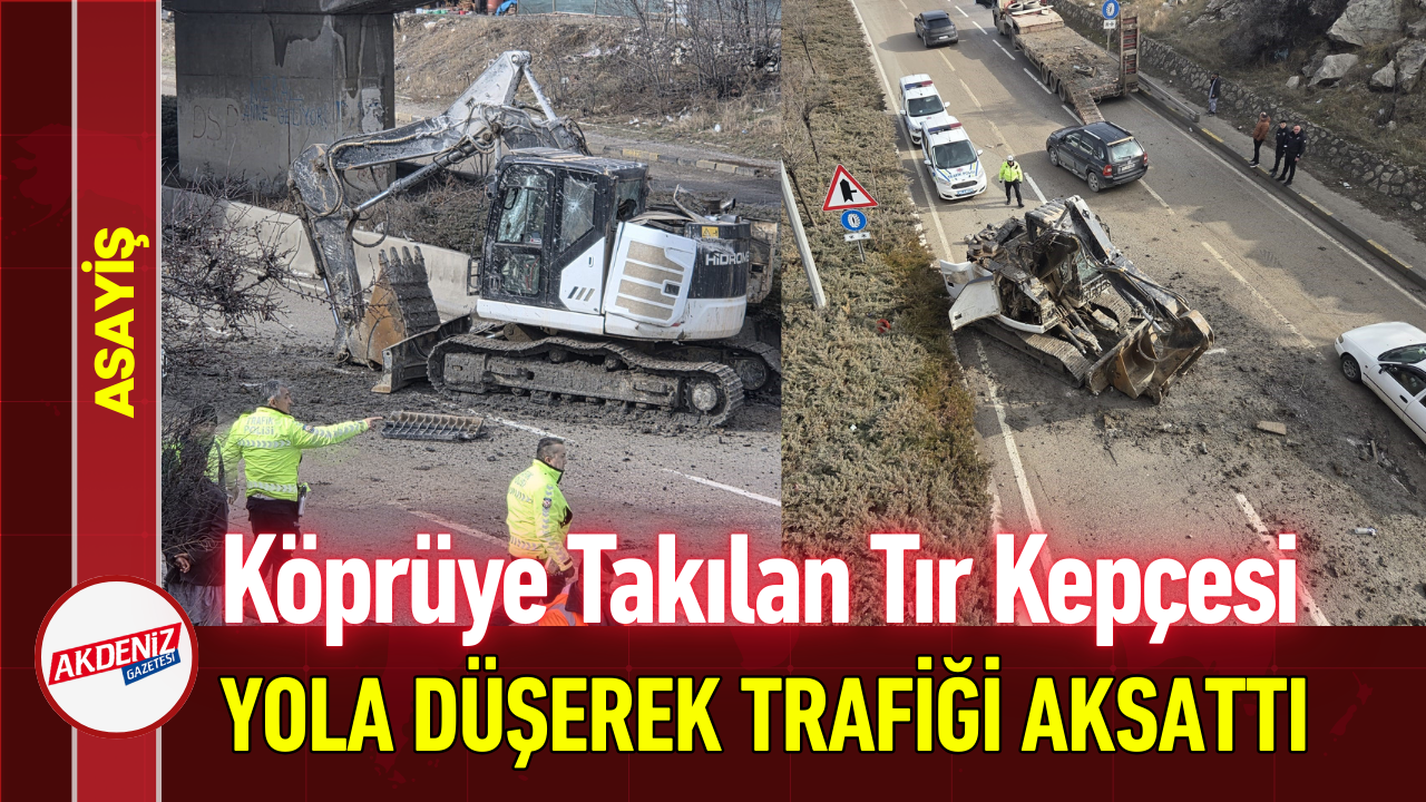 Ankara'nın Elmadağ ilçesinde, bir tırın üzerinde bulunan kepçe, köprü altından geçiş sırasında köprüye takılarak yola düştü ve facia kıl payı atlatıldı.