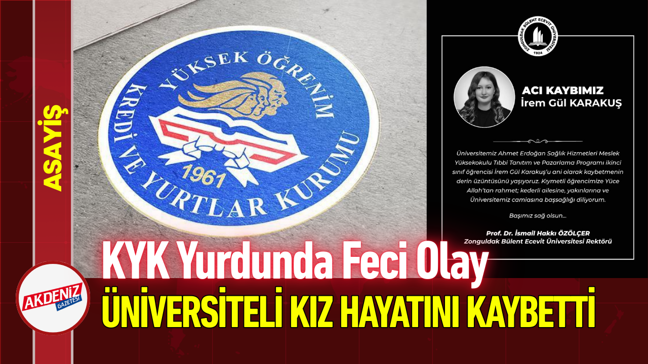 Olay, akşam saatlerinde Kozlu ilçesinde KYK'a ait bir öğrenci yurdunda meydana geldi. Edinilen bilgilere göre, Bülent Ecevit Üniversitesi Ahmet Erdoğan Sağlık Hizmetleri MYO Tıbbi Tanıtım ve Pazarlama Programı 2. sınıf öğrencisi İrem Gül Karakuş, dün gece saatlerinde henüz bilinmeyen bir nedenle yurdun 9. katından aşağı düştü. Çevredekilerin ihbarı üzerine olay yerine sağlık ve polis ekipleri sevk edildi. Ağır yaralanan Karakuş, BEUN Hastanesine kaldırıldı ancak yapılan tüm müdahalelere rağmen kurtarılamadı. Olayla ilgili polis ekiplerinin geniş çaplı inceleme başlattığı öğrenildi.