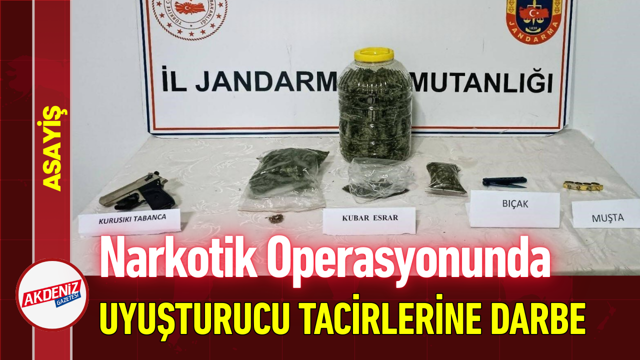 Düzce Cumhuriyet Başsavcılığı koordinesinde, İl Jandarma Komutanlığı ekiplerince yürütülen takipli narkotik operasyonunda Merkez ilçede M.K. isimli şahsın evinde ve eklentilerinde uyuşturucu bulundurduğuna yönelik duyum alındı. Yapılan istihbari çalışmalar sonucunda yapılan operasyonda bidon içerisinde bin 13 gram esrar maddesi, 1 adet muşta, 1 adet kelebek bıçak ve 1 adet kurusıkı tabanca ele geçirildi.