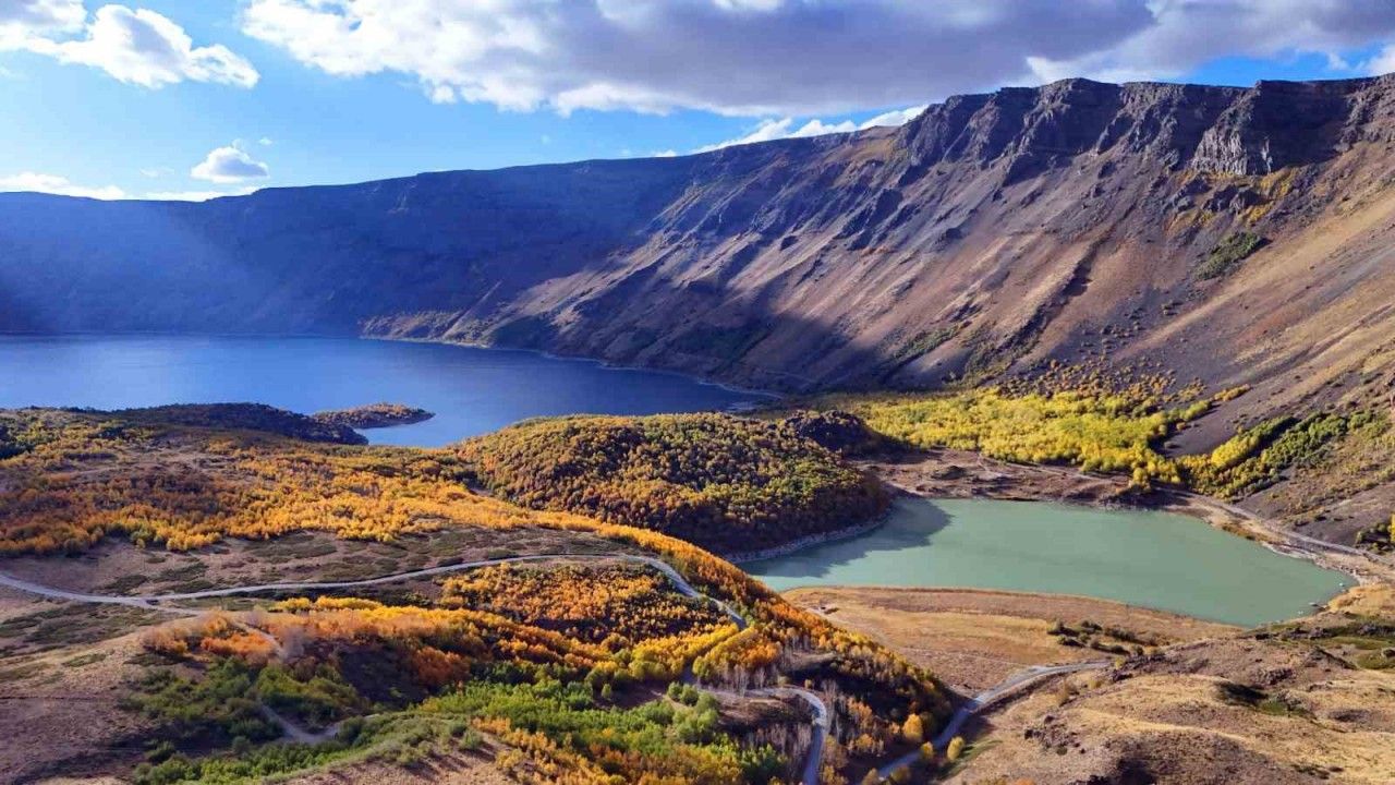 Bitlis’in Tatvan, Ahlat ve Güroymak ilçe sınırları içinde bulunan Nemrut Krater Gölü ve Nemrut Kalderası, sonbahar güzelliğiyle hayranlık uyandırıyor.
