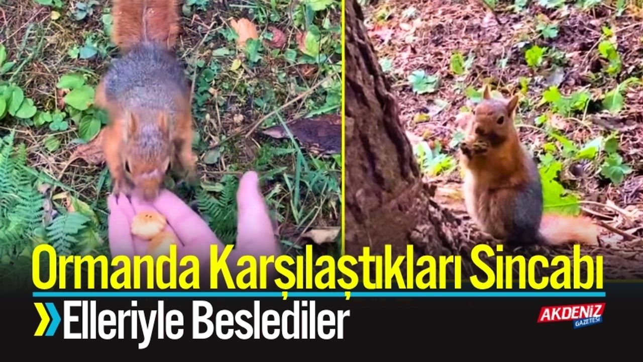 Düzce'de serinlemek için ormana giden bir aile ormanlık alanda sincapla karşılaştı. Sincabı elleri ile besleyen aile, o anları cep telefonu kamerası ile kaydetti.