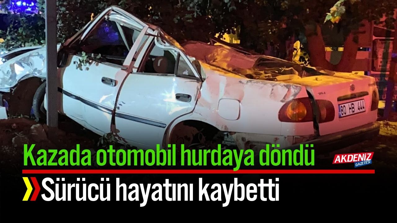 Kavşakta bulunan direğe çarpan araç adeta hurdaya döndü.