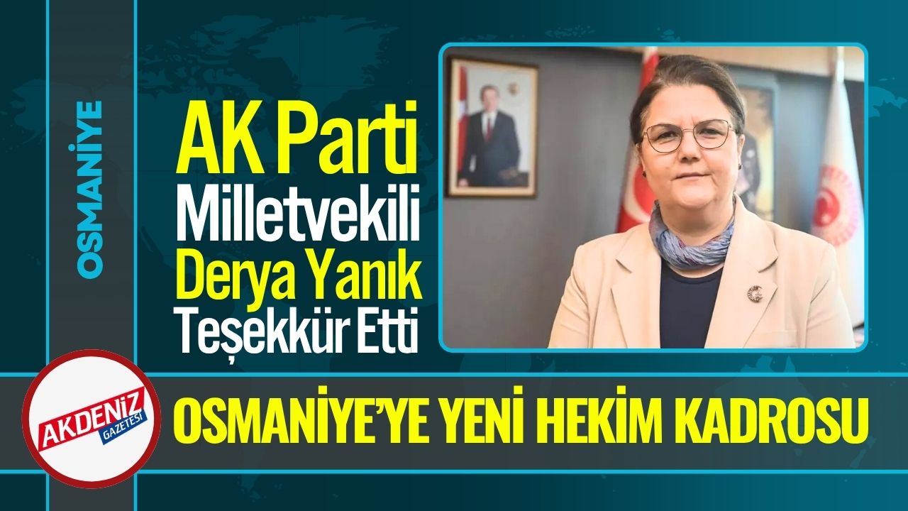 AK Parti Osmaniye Milletvekili ve TBMM İnsan Hakları İnceleme Komisyonu Başkanı Derya Yanık, Sağlık Bakanlığı tarafından gerçekleştirilen 125. Dönem Devlet Hizmeti Yükümlülüğü (DHY) Kurası sonucunda Osmaniye’ye tahsis edilen yeni hekim kadrolarıyla ilgili bir teşekkür etti.