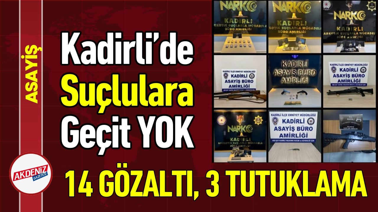 Kadirli polisi tarafından ilçe genelinde eş zamanlı olarak yürütülen asayiş uygulamaları ve narkotik operasyonlarında toplam 14 şüpheli yakalanarak gözaltına alındı. Şüphelilerin ikametlerinde ve araçlarında yapılan aramalarda adeta bir cephanelik ele geçirildi.