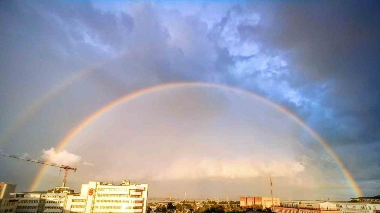 Yağışın sona ermesiyle birlikte Samsun semalarında beliren rengarenk gökkuşağı, şehrin manzarasını değiştirdi. Renklerin tüm tonlarını barındıran gökkuşağı, mavisini Karadeniz’in ufuk çizgisiyle birleştirerek izleyenlere görsel bir şölen sundu.