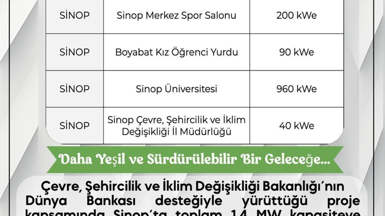 Sinop Valiliği’nden yapılan açıklamada, kurulacak güneş enerjisi sistemlerinin toplamda 1,4 MW kapasiteye sahip olacağı belirtildi. Bu sayede kamu kurumlarının enerji ihtiyacının büyük bölümü güneşten karşılanacak.