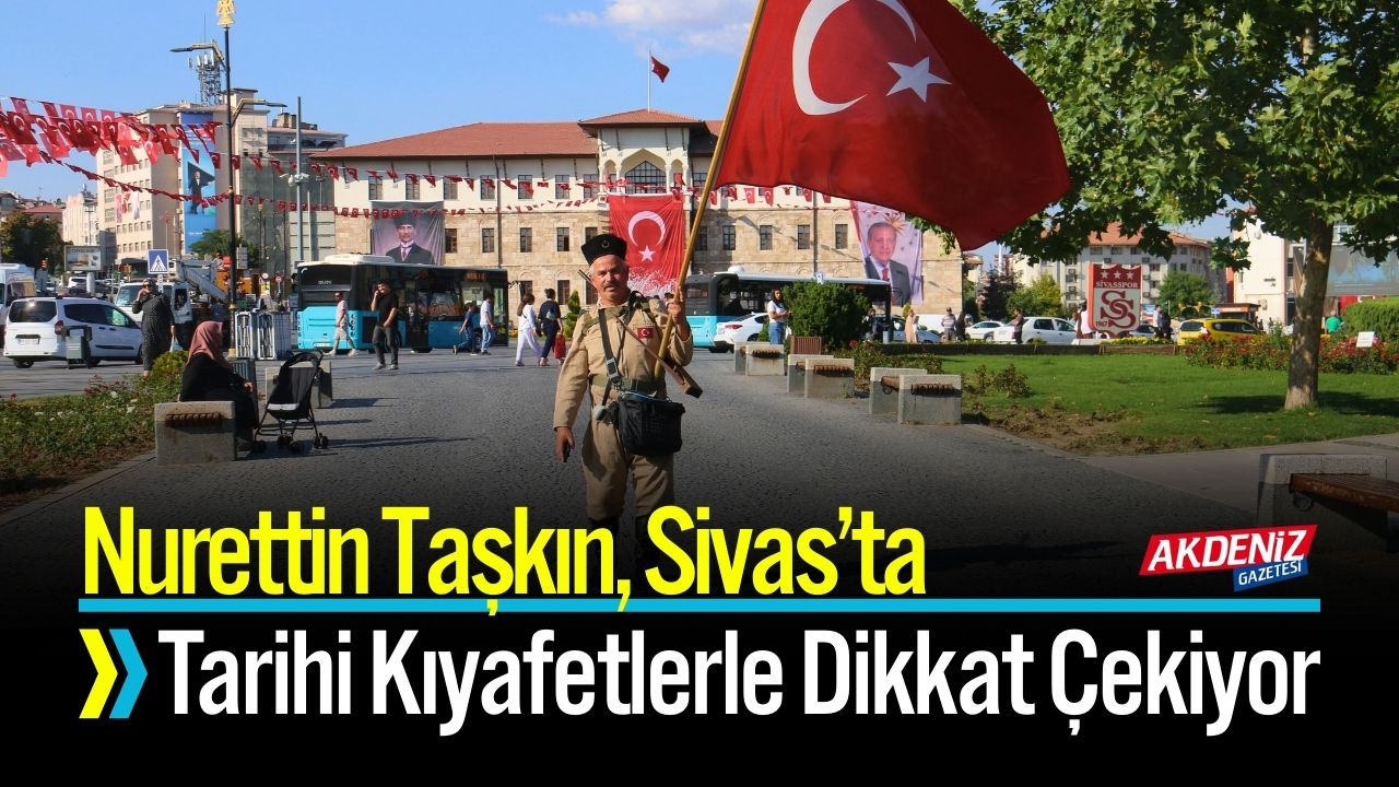 Sivas’ta milli gün ve haftalarda tarihi kıyafetler giyen Nurettin Taşkın, dev Türk bayrağıyla kentte yürüyerek dikkat çekiyor.