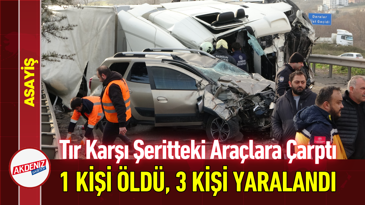 Samsun’un Canik ilçesinde kontrolden çıkan tırın karşı şeride geçerek otomobil ve SUV araca çarpması sonucu tır sürücüsü hayatını kaybetti, 3 kişi yaralandı.