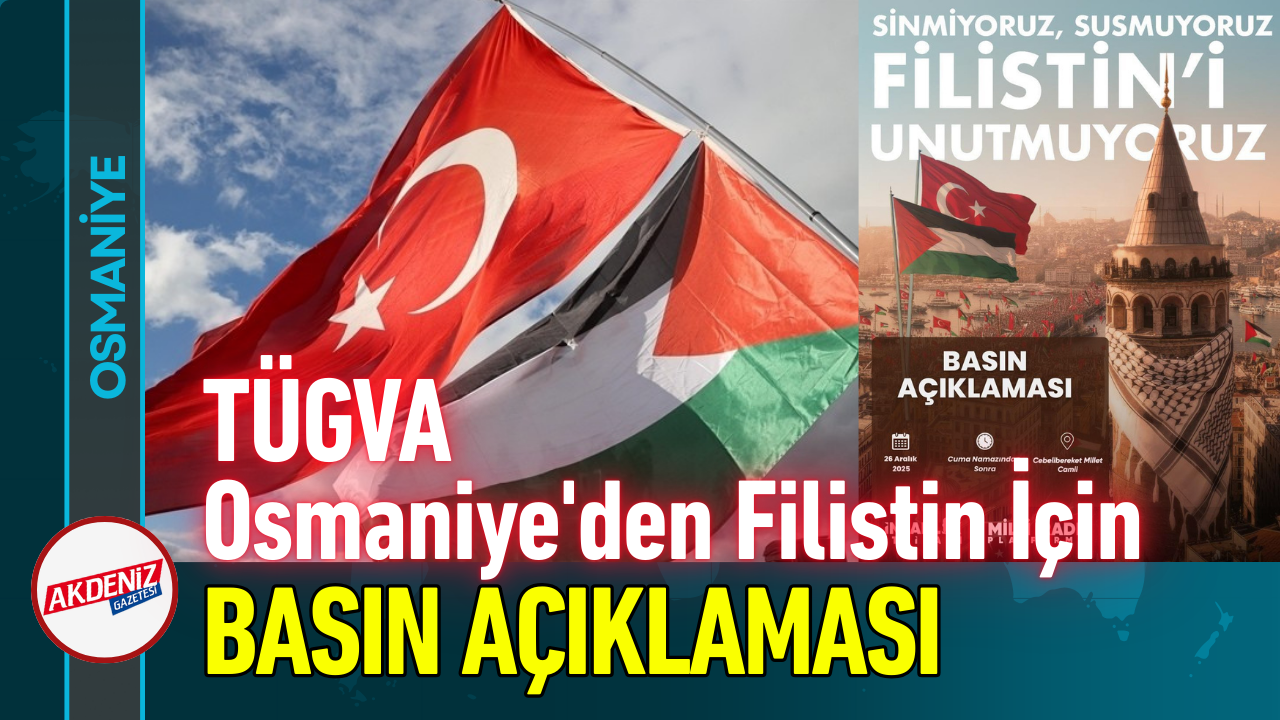 Türkiye Gençlik Vakfı (TÜGVA) Osmaniye İl Temsilciliği, Filistin’de yaşanan insanlık dramına dikkat çekmek ve kamuoyunu bilgilendirmek amacıyla basın açıklaması düzenleyecek. Açıklamanın, 26 Aralık Cuma namazının ardından Cebelibereket Millet Camii’nde gerçekleştirileceği bildirildi.