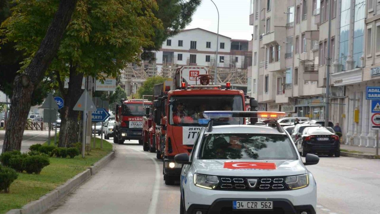 Türk bayrakları ile özel olarak donatılan itfaiye araçlarından oluşan uzun konvoy, Fevzi Çakmak, Kaledere, Burunucu, Ortayılmazlar mahalleleri ile Devlet Sahil Yolu güzergâhında ilerleyerek vatandaşları selamladı.