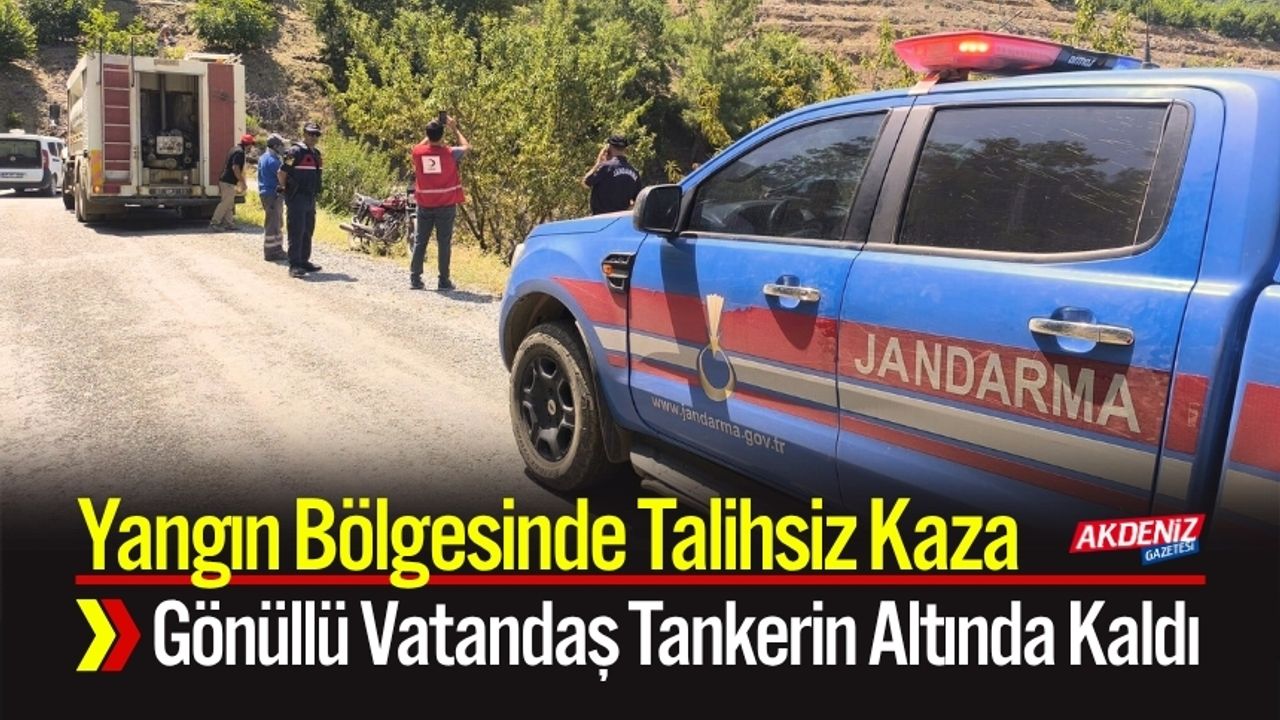 Antalya'nın Gazipaşa ilçesinde iki gündür devam eden orman yangınında söndürme çalışmaları aralıksız sürerken, Doğanca Mahallesi’nde yaşanan kaza dikkat çekti. Yangına gönüllü olarak destek veren Tufan Y. isimli vatandaş, kullandığı motosikletle su tankerinin altında kaldı.